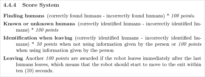 タスクは計11種類あり,各タスクには,制限時間と配点(1000点または2000 点満点)があります. 例えば,"Who Is Who"タスク(7分以内に部屋の中にいる既知または未知の人物を発見し,顔 を覚える)では,1人発見すると100ポイント,覚えた人物に再度会っ た場合に認識成功で100ポイント,などと決められています. また,"Walk & Talk"タスク(部屋のマップが与えられず,人間と音声対話しなが らテレビや食器棚の場所を覚える)では,テレビや食器棚に到達できれば各 250ポイントを得ることができます. 一次予選の得点上位10チームが二次予選に進み,二次予選の上位5チームが決勝 を行います. 決勝の自由演技は審査員によって評価され,それまでのタスクの得点と合計 して最終順位が決定します.