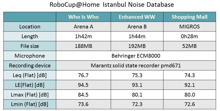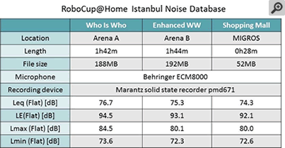 These databases can be used for testing your robot's speech recognition system. Play these files at 75dB (very noisy) and you can simulate noise conditions at typical RoboCup@Home environments.